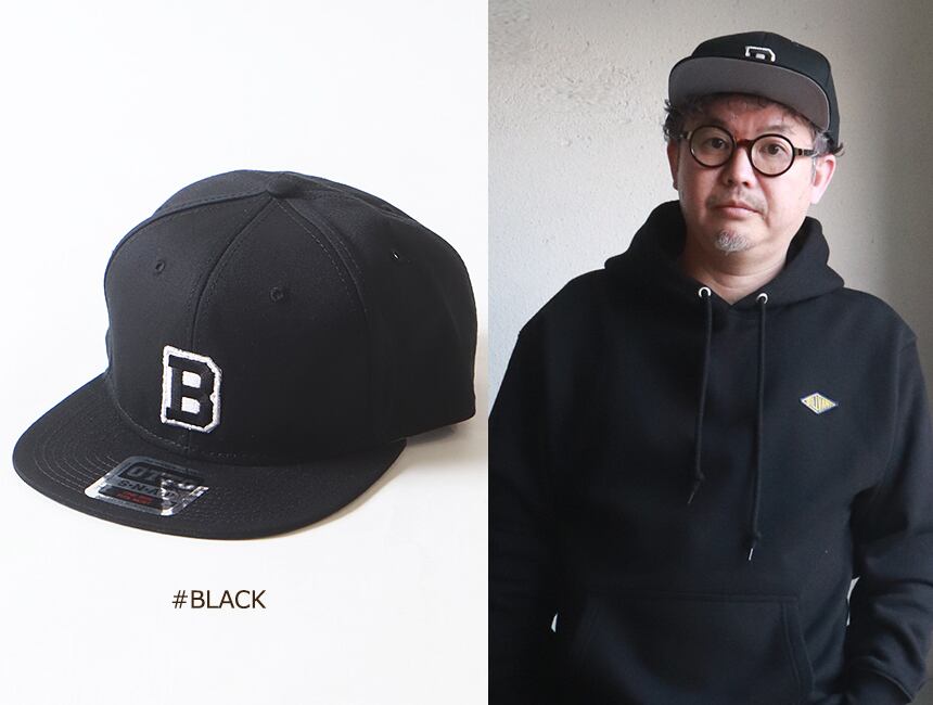 ・カジュアルなフラットバイザーで、フロント部分に「B」ロゴワッペンを配置。